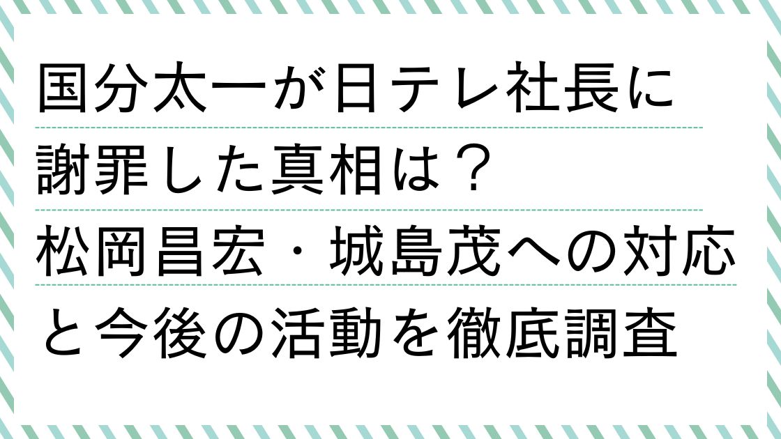 本記事では、国分太一さんが日テレ社長へ謝罪に至った真相と、その背景にあるコンプライアンス問題、そして袂を分かつ形となった松岡昌宏さん・城島茂さんの対応について、2026年現在の最新情報を徹底調査しました。