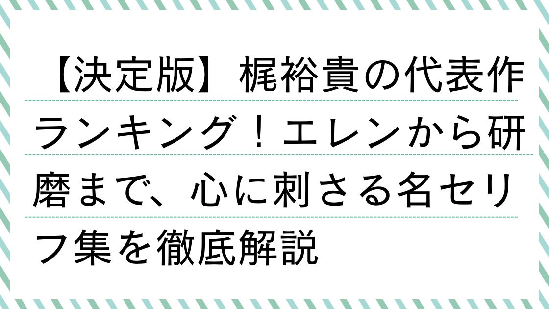 日本を代表するトップ声優、梶裕貴さん。熱血漢から無気力な少年まで、幅広いキャラクターに命を吹き込むその圧倒的な演技力は、世界中のアニメファンを魅了し続けていますよね。「梶裕貴の代表作ランキング!エレンから研磨まで、心に刺さる名セリフ集」と題して、彼の魂の込もった演技の魅力と軌跡を徹底的に振り返っていきましょう!